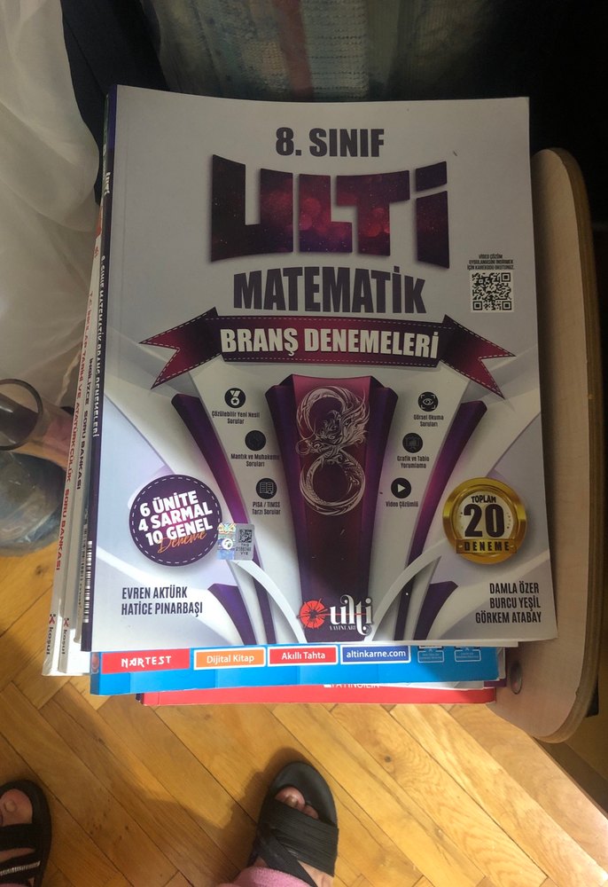 8. Sınıf Ulti Matematik Branş Denemeleri kitabı 6 ünite, 4 sarmal ve 10 genel deneme içerir. Yazarlar: Evren Aktürk, Hatice Pınarbaşı, Damla Özer, Burcu Yeşil, Görkem Atabay.