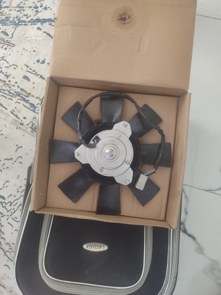 Gri renkli, siyah kanatlara sahip fan bej karton kutu içinde yer alıyor. Elektrik bağlantısı bulunmakta ve mekanik ya da otomotiv kullanımına uygun görünüyor. ⚙️