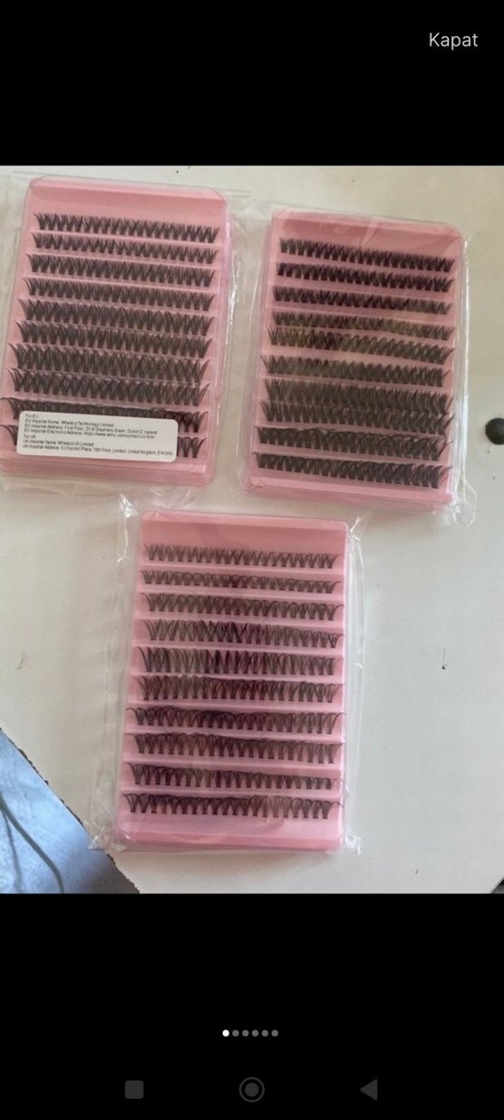 Pembe kutularda düzenlenmiş koyu renk takma kirpikler, doğal bir görünüm için gözleri belirginleştirir.