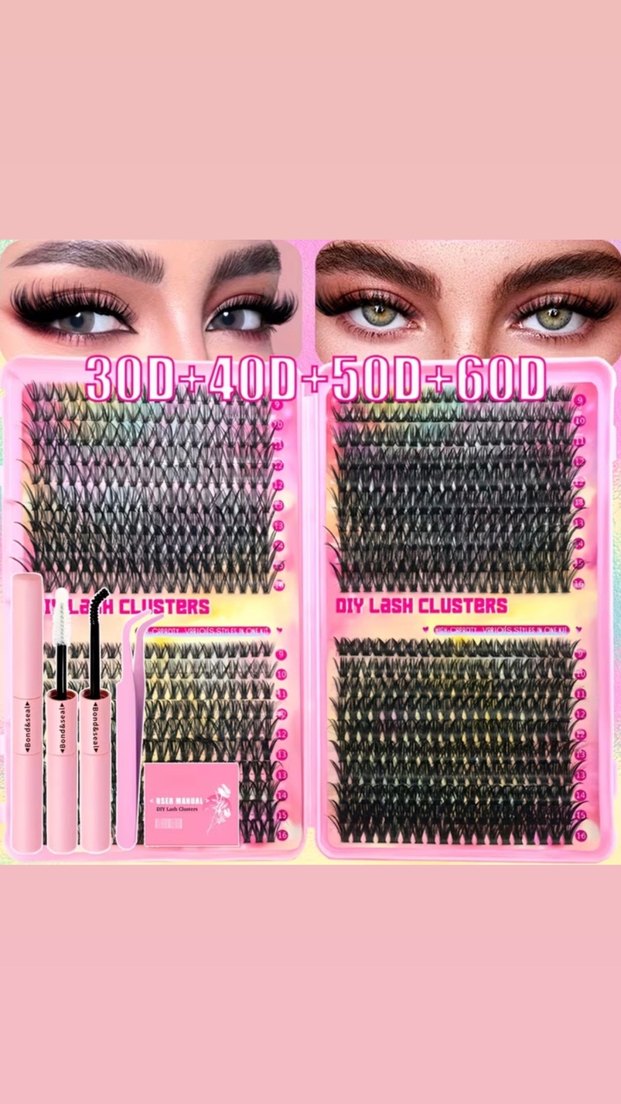 Koyu pembe renkli 30D, 40D, 50D ve 60D takma kirpik kümeleri içeren set. Yapıştırıcı ve cımbız dahildir