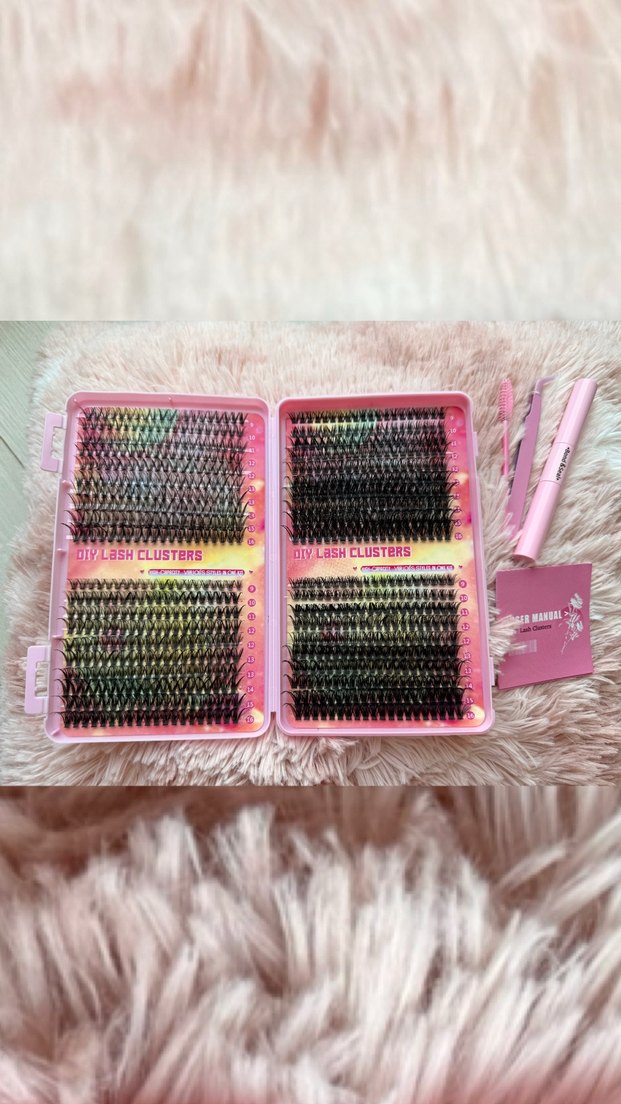 Pembe pastel renklerde DIY kirpik kümeleri ve kullanımı kolay iki aplikatör içeren takma kirpik seti. Canlı göz makyajları için uygun.