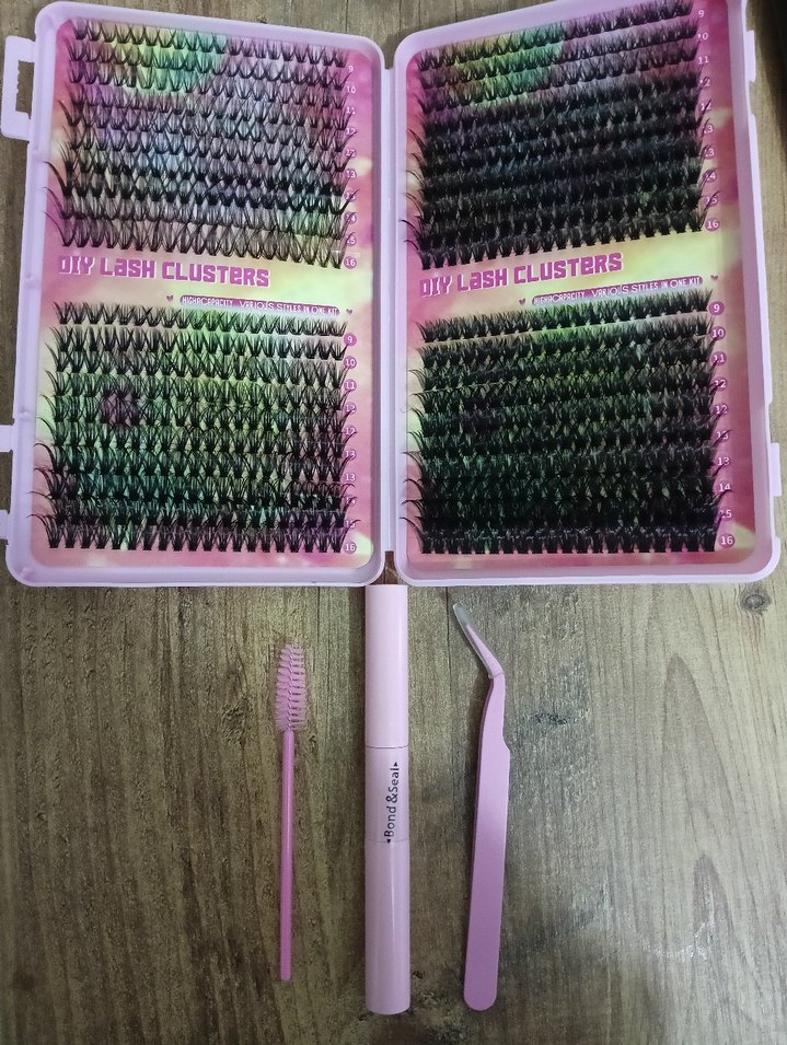 Uygulama fırçası ve cımbız içeren pembe pastel takma kirpik kümeleri seti. OIYLBSHCLUSTERS markalı kutu.