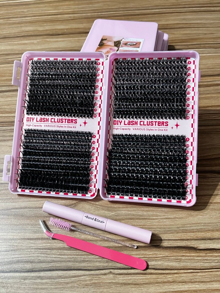 Pembe kutusunda koyu renk takma kirpik seti,, uygulama aparatı ve fırça içerir.