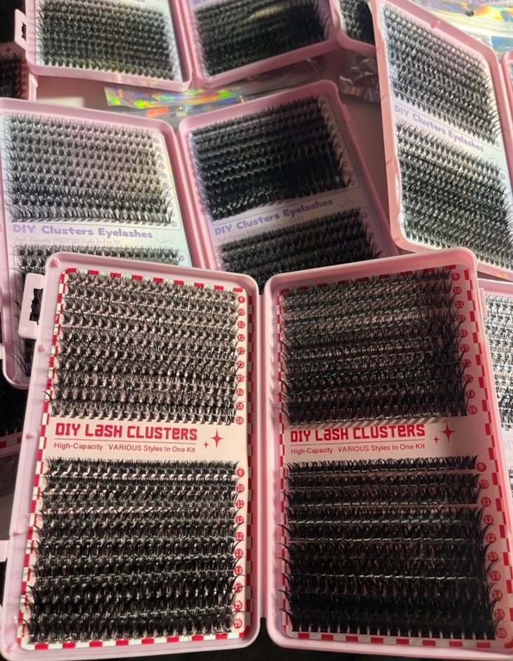 Renkli gri takma kirpik seti, çeşitli stil seçenekleri sunan DIY cluster tarzında. "IY LaSH" etiketi bulunur. ✨ paket içeriği yalnızca kirpiktir
