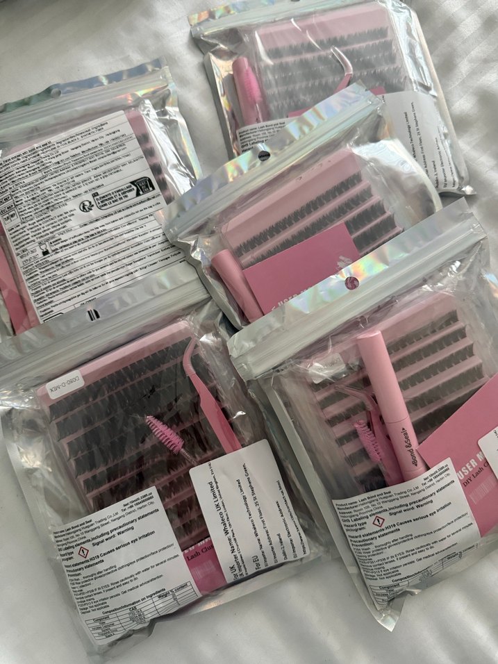 Pastel pembe takma kirpik seti, uygulama aparatlarıyla birlikte, yeniden kapatılabilir poşetlerde düzenli şekilde paketlenmiştir. Göz görünümünü kolayca güçlendirir.