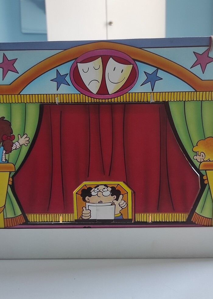 Az kullanılmış, artık üretilmeyen bir kutu oyunu. Kutudan çıkan kartonetlerle bir tiyatro sahnesi ve karakterler oluşturuluyor. 2 grup karakter var. Fotoğraflarda mevcut. Çocuklarla keyifli ve yaratıcı vakit geçirmek ya da oyun koleksiyonuna dahil etmek için kullanabilirsiniz:)