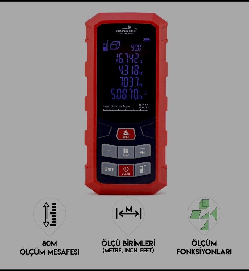 Koyu renkli lazer mesafe ölçer 80 metreye kadar ölçüm yapar ve metre, inç, feet birimlerini destekler. Hassas ölçüm için çeşitli fonksiyonlar sunar.