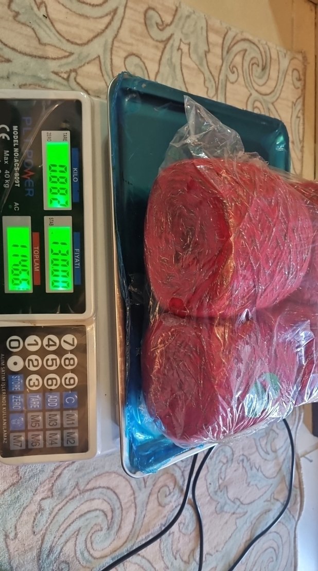 Plastik ambalaj içinde, tartıda 13.000 gram ağırlığında kırmızı örgü ip seti.
