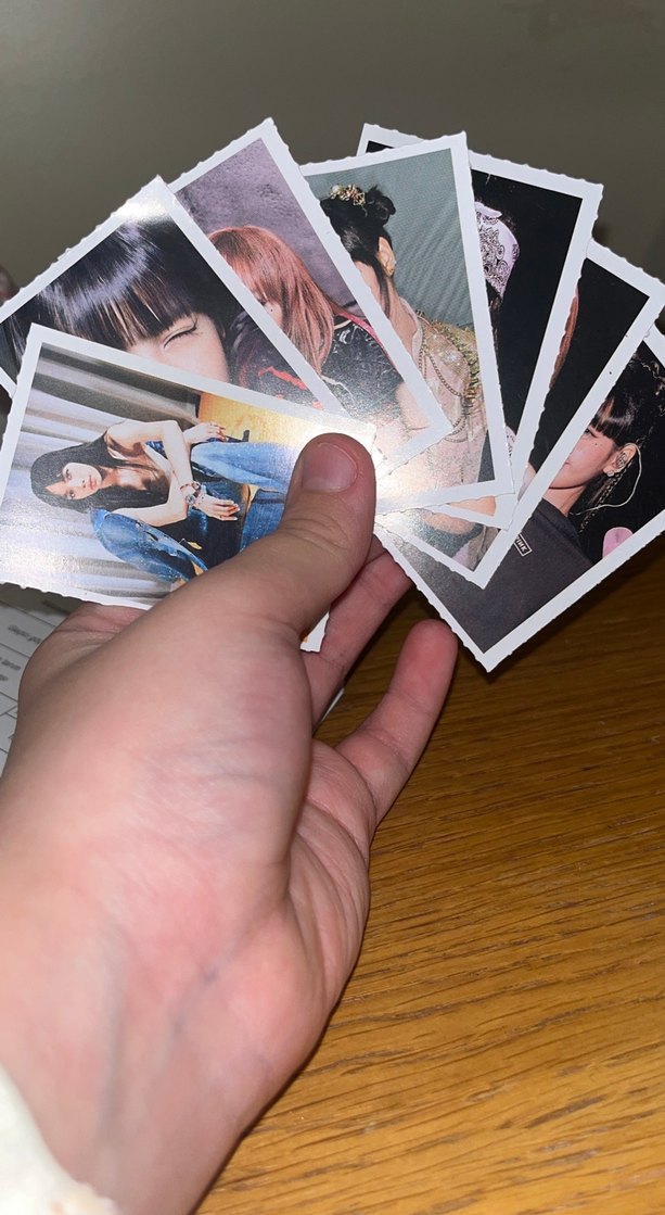 Elinizde tutulan çeşitli portrelerden oluşan parlak fotoğraf kartları seti.