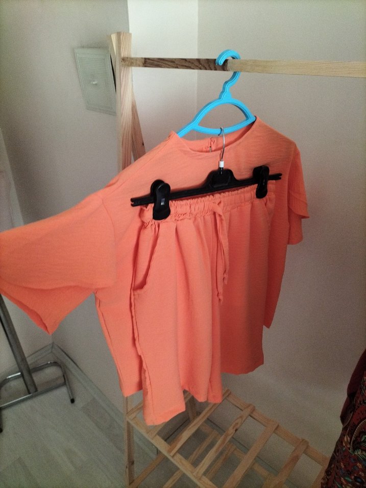 turuncu ayrobin kumaştan, kısa kollu ve yuvarlak yakalı, salaş kesim mini tişört, şort takım .hiç bir kullanılmadı yeni kendi dikimim