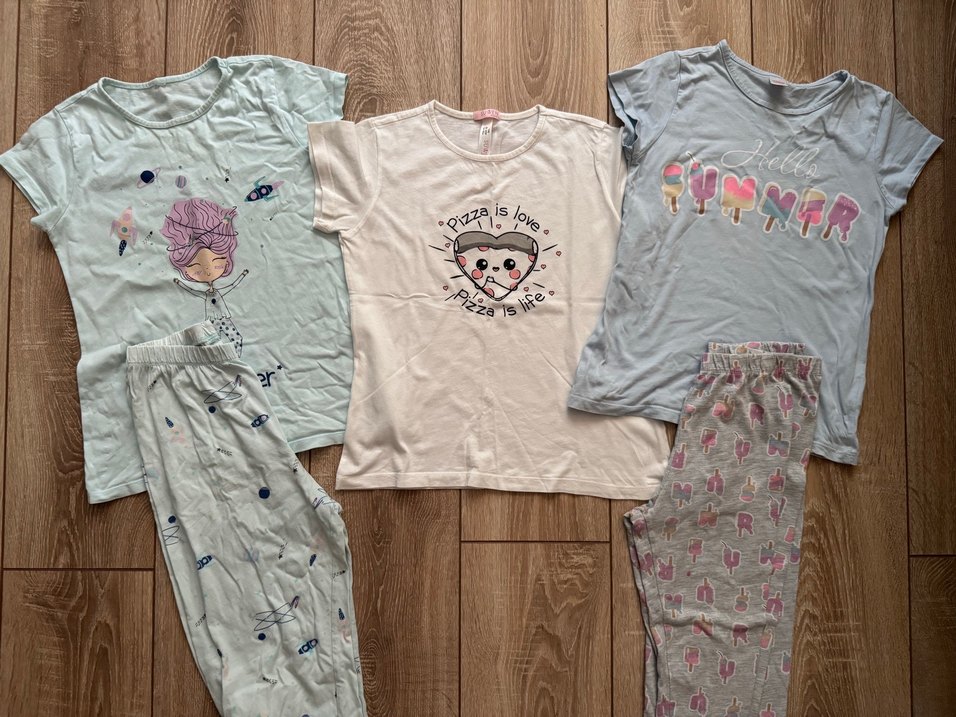 Kızlı olan 9-10 yaş LCW marka etiketi sökülürken ufak bir delinmiş. Dondurmalı olan 8-9 yaş LCW marka. Ufak tefek lekeleri mevcut. Pizzalı pijama üstü suwen marka ve sıfırdır hiç giyilmedi 9-10 yaş. Toplu fiyattır