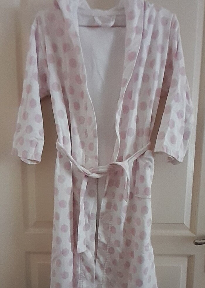 BEYAZ ÜZERİ PEMBE PUANTIYELI 9-10 YAŞA UYGUN BORNOZ. ICI BEYAZ PAMUKLU DIŞI KADIFEMSI YUMUSAK. KIZIM BU BORNUZU HAVUZDA DA COK RAHAT KULLANDI. ÇOK HAFİF YUMUŞACIK. BEDEN SECME KISMINDA 8 YAŞA KADAR SEÇENEK ÇIKTI.