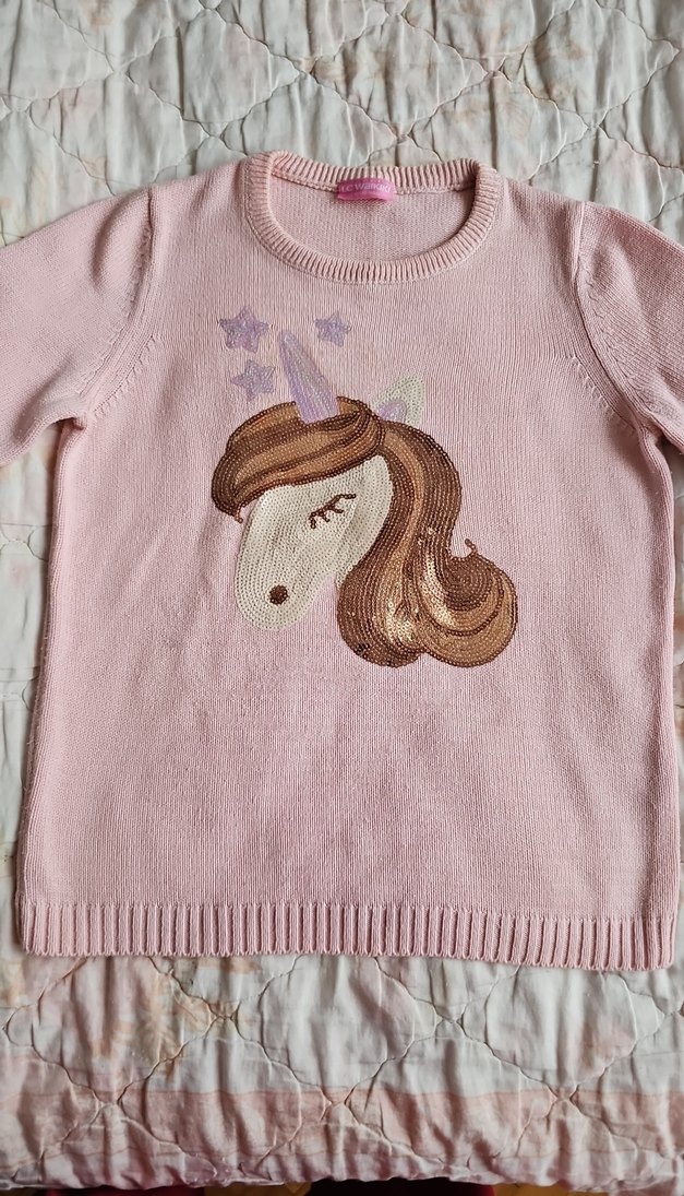 LCW Marka 9-10 yaş, acik pembe, önü pul işlemeli Triko kazak. bazi yerlerinde ufak lekeler var. fotoğraflarda gösterdim. bunu bilerek alın. iade ile uğraşmayalım.