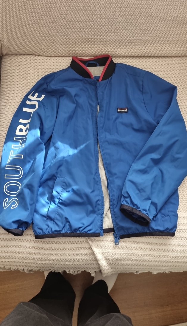 Bu erkek rüzgarlık, parlak mavi renkte, fermuarlı ve uzun kolludur. Yumuşak fleece kumaştan, bol kesim ve çıtmalı yaka ile rahat sokak stiline uygundur. Kollarda 'SOUTHRBLUE' yazısı bulunur. ️