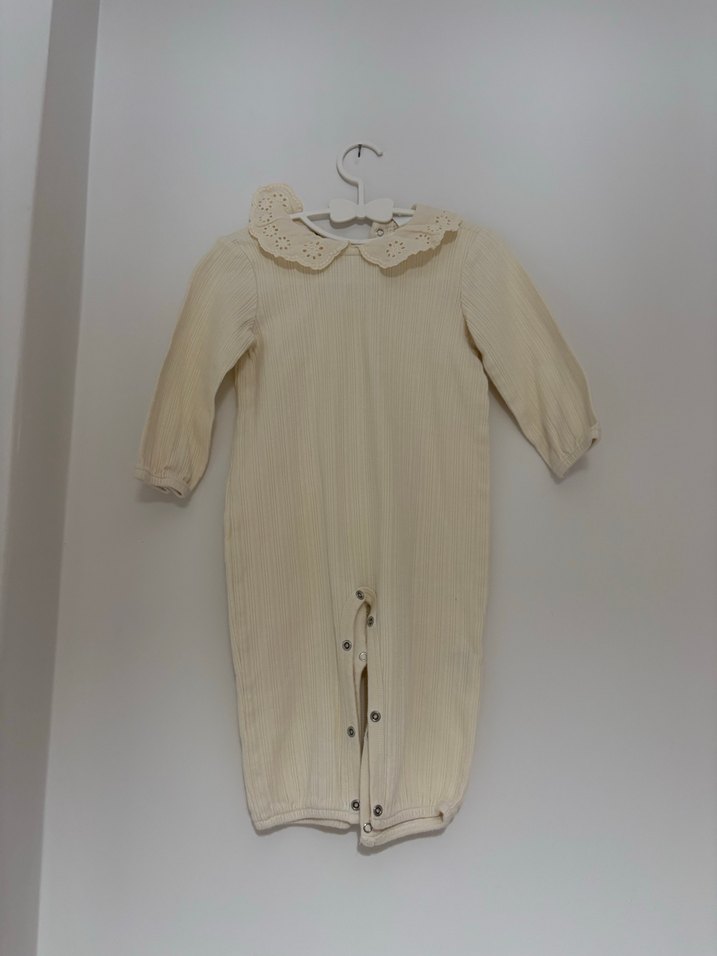 Düğmeli, uzun kollu pastel beyaz bebek kız tulumu, zarif dantel yakalıdır.