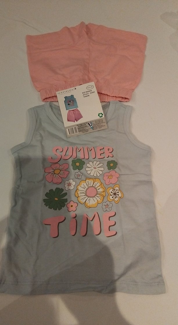 Mavi Pembe renkli, Atlet Şort Takım 9-12 ay kız bebek renkli çiçek baskısı ile "SUMMER TIME" yazılıdır.şık ve rahat bir tasarıma sahiptir. hijyen nedeniyle iade kabul olmamaktır