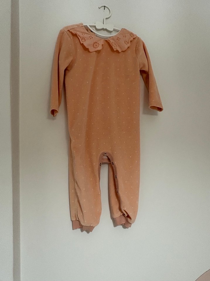 Dantel yaka detaylı, uzun kollu pastel renk bebek tulumu. Yumuşak ve rahat kumaştan üretilmiştir.