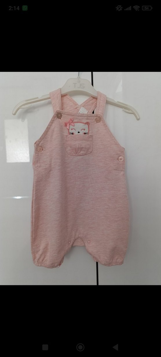 Pastel pembe renkte, örgü dokulu, kız çocuklar için askılı ve kolsuz tulum. Rahat hareket için bol kesim ve önünde sevimli kedi desenli küçük cep bulunur.