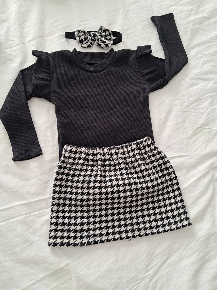 Uzun kollu siyah örgü üst, omuzlarda hafif fırfır detaylıdır. Gri ve siyah kazayağı desenli etek ve uyumlu saç bandı ile tamamlanmıştır. 1 kere evde 1 kere dışarıda giyildi başka giyilmedi