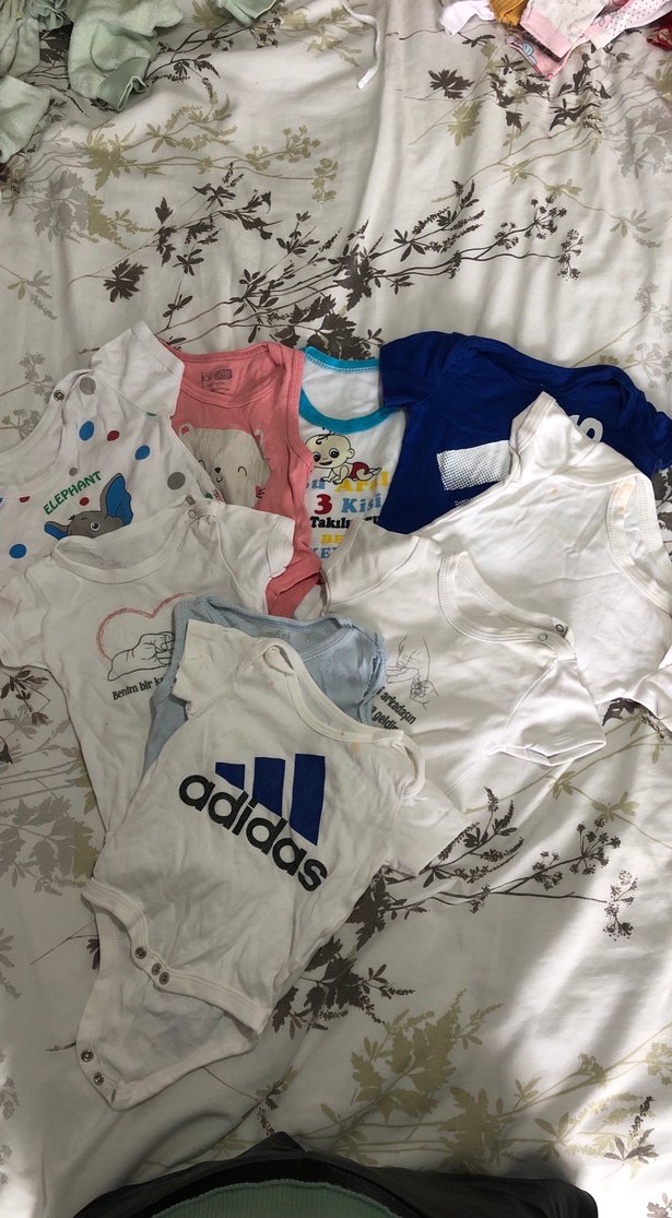 Dokuz adet kısa kol Beth sıfır kol Zıbın sorunları olanın fotoğraflarını çektim bir iki tanesi lekeli ama çıkmıycak lekeler değil çamaşır suyla yıkanırsa çıkacak lekeler bir tanesi de sökük ben kızıma sökük haliyle giydirdim dikmedim o yüzden dikmekle uğraşmadım Üç ila altı ve dokuz ay arası karışık uyumlu