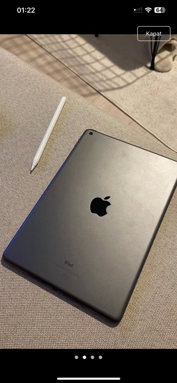 Gri renkli Apple iPad ve yanında beyaz stylus kalem, dokulu bir yüzey üzerinde yer alıyor. Tabletin arkasında Apple logosu bulunuyor.