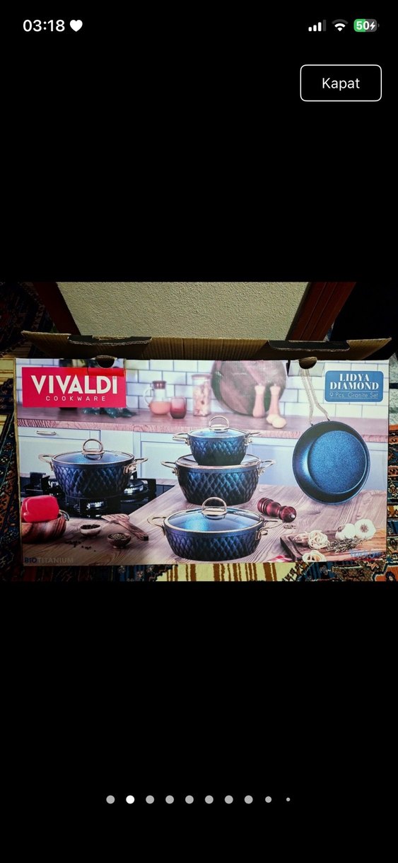 Vivaldi Diamond 9 parçadan oluşan mavi renkli tencere seti, kapaklı ve eldesi bulunan tencereler ve tava içerir.