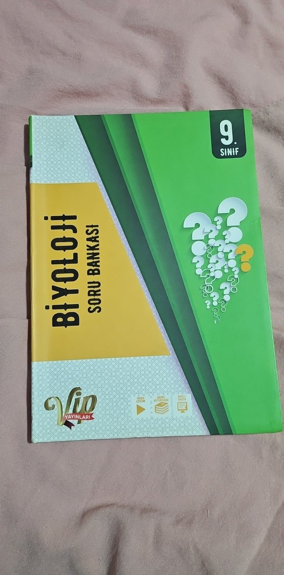 9. sınıf biyoloji soru bankası, lise öğrencileri için hazırlanmış. Yeşil ve sarı kapaklı, soru işaretleri görselli. İlk ünitenin bir kısmı çözülü onun dışında tertemiz