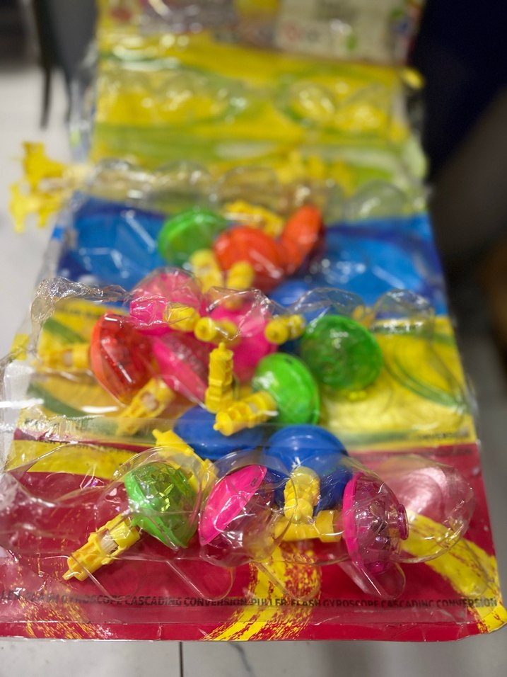 Birbirine sarı eklemlerle bağlı çok sayıda parlak parçadan oluşan renkli plastik oyuncak seti, şeffaf ambalajda.