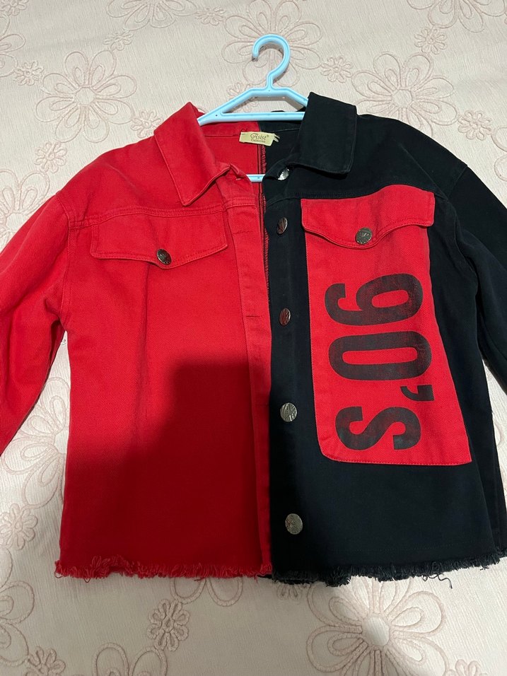 Kadınlar için kısa boy kırmızı siyah renk bloklu denim ceket, '90's' baskılı detaylıdır. Uzun kollu, düğmeli ve notlu yakalıdır, bol kesimdir. Günlük sokak stiline uygundur.