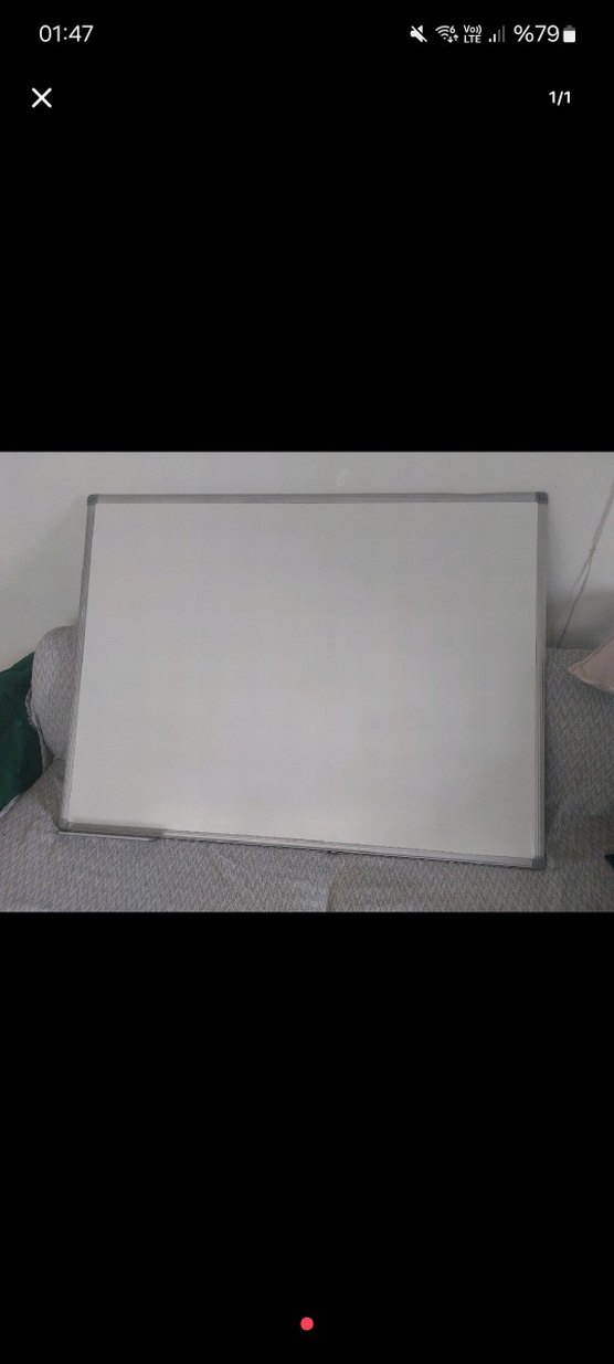90x120 BÜYÜK BOY BEYAZ YAZI TAHTASI Duvara monte edilebilir. Yüzeyi temiz ve pürüzsüzdür, yazı sonrası leke bırakmaz. Çizik, kırık veya deformasyon yoktur. Çok temiz kullanılmıştır. Kalem ve silgi koymak için hareketli alt rafı bulunmaktadır. Ev, ofis, ders çalışma veya toplantı için idealdir. İsteyen alıcıya yakından gösterilir. Büyük ve temiz yazı tahtası arayanlar için hazırdır. Ciddi alıcıya yardımcı olunur.