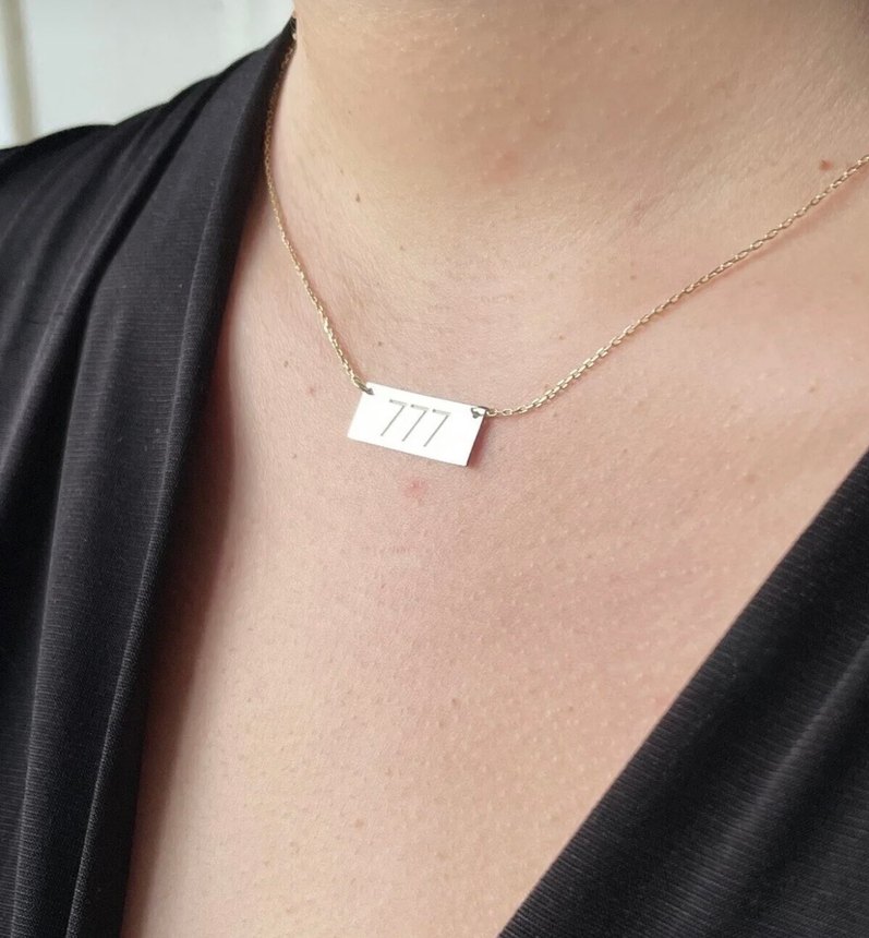 Altın renkli, zincir detaylı ve üzerinde '777' yazılı baskılı dikdörtgen kolye ucu bulunan midi uzunlukta minimalist kolye. Cesur sokak stili ve romantik akşamlar için uygundur. ✨