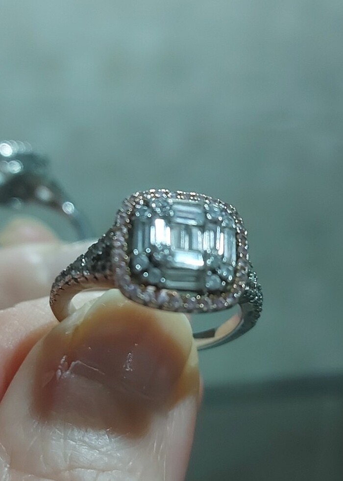 COK DEĞİŞİK BIR MODEL,925 AYAR BAGET TAŞLI GÜMÜŞ YÜZÜK, ÇEVRE TASLARI BIR SIRA UCUK PEMBE, KUYUMCU OLCUSUYLE 16 NUMARADIR