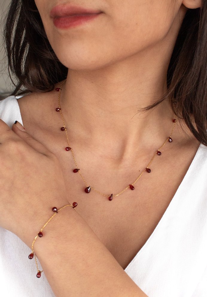 Ürün Tipi : 925 Ayar Gümüş (Altın Kaplama) Doğal Taş Bileklik ve Kolye (Set) Taş Cinsi %100 Doğal Garnet | Semi Precious ( Yarı Değerli ) Taş Kesimi Damla Elmas Kesim Damla (Diamond Cut) Taş Boyutu Yaklaşık 7x5 mm - 8x6 mm (Doğal form) Zincir Uzunluğu (Bileklik) 16 cm + 3 cm (Kolye) 40+5 cm Uzatma Payı Zincir Tipi Forse / İnce Baklalı Gümüş Materyal (Maden) : (Altın Kaplama ) 925 Ayar Gümüş ' 6,50 Gr Gümüş ve 18 Ct Yarı Değerli Taş ' Kapama Türü: Papağan Klips Bakım Önerisi Ürününüzün ilk günkü parlaklığını koruması için; deniz, havuz suyu, deterjan ve parfüm gibi kimyasallardan uzak tutulması önerilir. Kullanım sonrası yumuşak kuru bir bezle silip kapalı bir kutuda muhafaza etmeniz, doğal taşların ve metalin ömrünü uzatacaktır. Müşterilerimiz İçin Not Kullandığımız taşlar gerçek doğal taşlar olduğu için, taşların renk tonlarında ve dokularında ufak farklılıklar görülebilir. Bu durum, aldığınız kolyenin dünyada sadece size özel ve tek olduğunun kanıtıdır