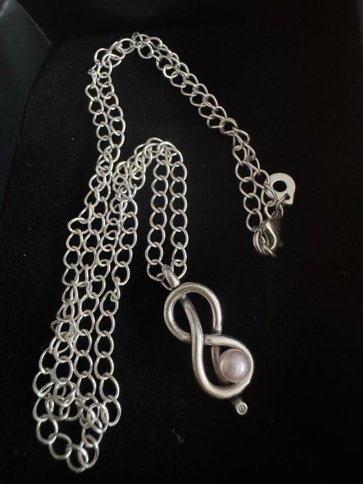 925 ayar Gümüş zincire sahip, sonsuzluk figürlü incili şık kolye. Günlük kullanım için ideal. Sıfır
