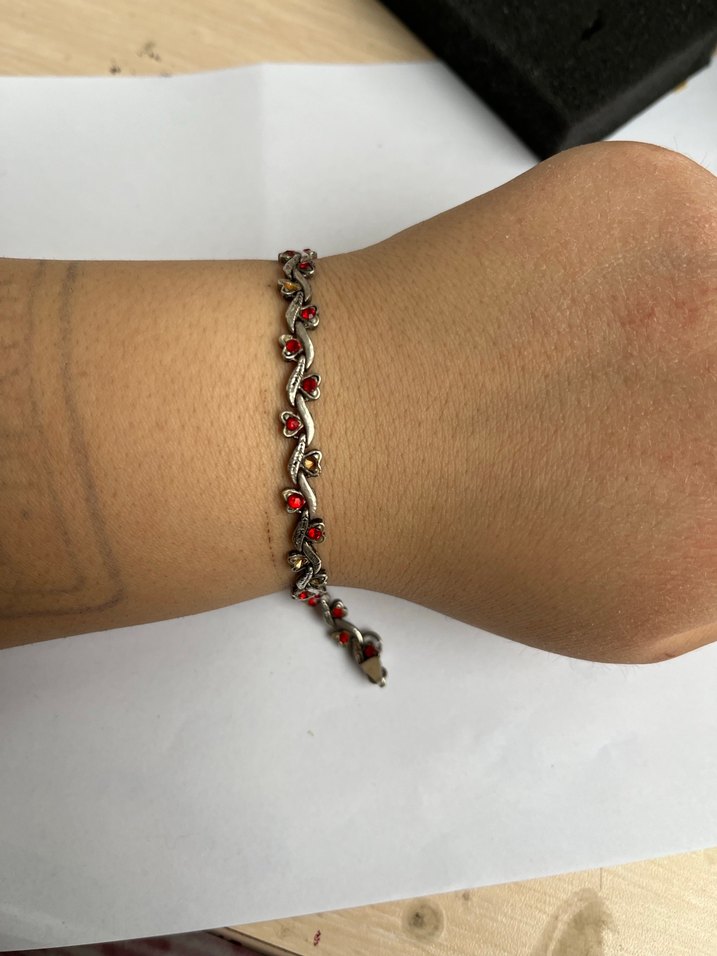 Koyu kırmızı yılan deseni ve zincir detaylı tasarıma sahip kadın bilekliği, günlük kullanım için bohem tarz sunar. KİMİ TAŞLARI DÜŞÜK taşların zaten herhangi bir doğal taş olduğunu düşünmüyorum ancak bilekliğin kendisi 925 ayar gümüştür taşları çıkarıp ya da yapıştırıp kullanabilirsiniz karartma detaylıdır