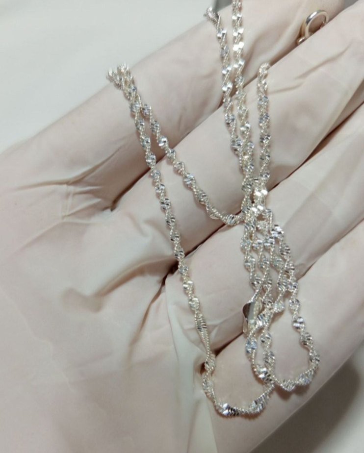 925 ayar gümüş kolye, singapur detaylı zincir bağlantılarına sahiptir. deseni ile günlük kullanıma uygun, çağdaş ve göz alıcı bir tasarımdır 2mm kalınlığında 53 cm uzunluğunda.