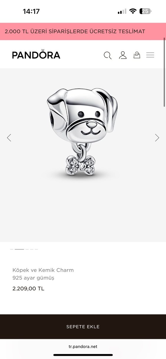 925 ayar gümüşten yapılmış, gri köpek yüzü ve fiyonk şeklinde kemik detaylı minimal tasarımlı charm.