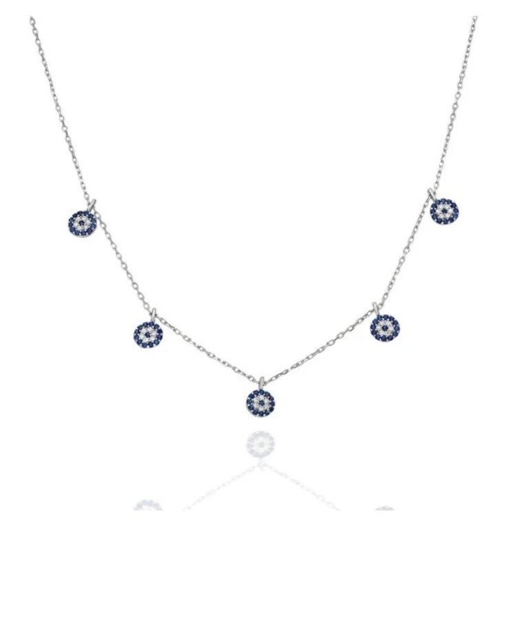 925 ayar gümüşten yapılmış, kısa uzunlukta, zincir detaylı ve üzerinde beş adet mavi nazar boncuğu bulunan mini kolye. Günlük kullanıma uygun, sade ve bohem tarzda.