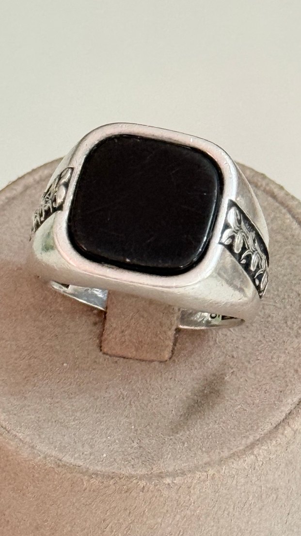 Kalem işçilikli her iki kenarı oltu taşlı 925 ayar gümüş kare formunda çok zarif şık kusursuz erkek yüzüğü tertemiz