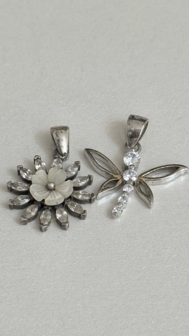 Papatya Sedef baget zirkon taş mıhlama işçilikli yusufçuk elmas kesim zirkon taş mıhlama işçilikli iki 2️⃣ adet 925 ayar gümüş kolye ucu birden