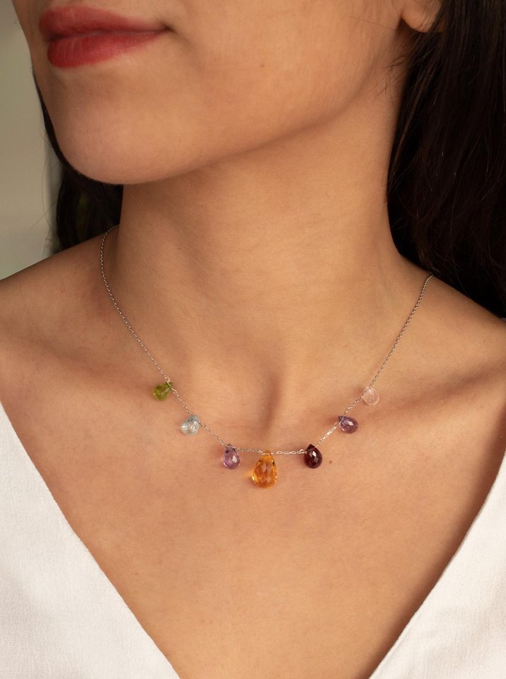 Teknik Detaylar & Paketleme Materyal: 925 Ayar Gümüş Rodium Kaplama '5,85 Gr Gümüş ve 18 Ct Yarı Değerli Taş Taş Tipi: %100 Doğal '' Amethyst,Citrine,Blue Topaz,Peridot,Rose Quartz,Granat'' Semi Precious | Yarı Değerli Kesim Formu: Drop Diamond Cut | Damla Elmas Kesim Uzunluk: Standart boya ek olarak ayarlanabilir uzatma zinciri mevcuttur (+5CM). Hediye Paketi: Sevdiklerinizi (veya kendinizi!) şımartmanız için korunaklı ve şık hediye kutusunda gönderilir. Bakım Önerisi Ürününüzün ilk günkü parlaklığını koruması için; deniz, havuz suyu, deterjan ve parfüm gibi kimyasallardan uzak tutulması önerilir. Kullanım sonrası yumuşak kuru bir bezle silip kapalı bir kutuda muhafaza etmeniz, doğal taşların ve gümüşün ömrünü uzatacaktır. Müşterilerimiz İçin Not Kullandığımız taşlar gerçek doğal taşlar olduğu için, taşların renk tonlarında ve dokularında ufak farklılıklar görülebilir. Bu durum, aldığınız kolyenin dünyada sadece size özel ve tek olduğunun kanıtıdır.