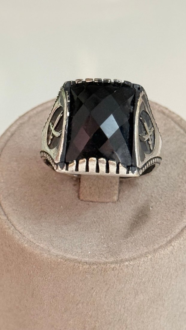 Her iki tarafında Hz Ali kabartma kılıç ⚔️ temalı siyah safir taşlı 925 ayar gümüş erkek yüzüğü