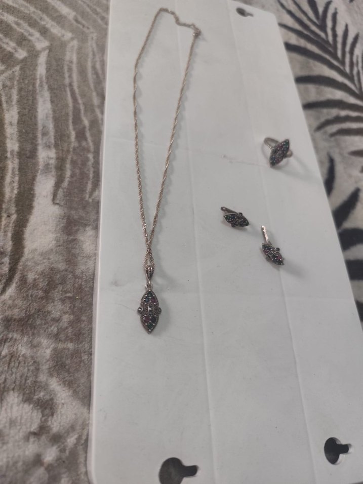 yüzük,kolye ve uyumlu küpelerden oluşan tarzda kadın takı seti. Günlük kullanıma uygun.mardin telkari 925 ayar gümüş hiç kullanılmamıştır alındığı gibi duruyor