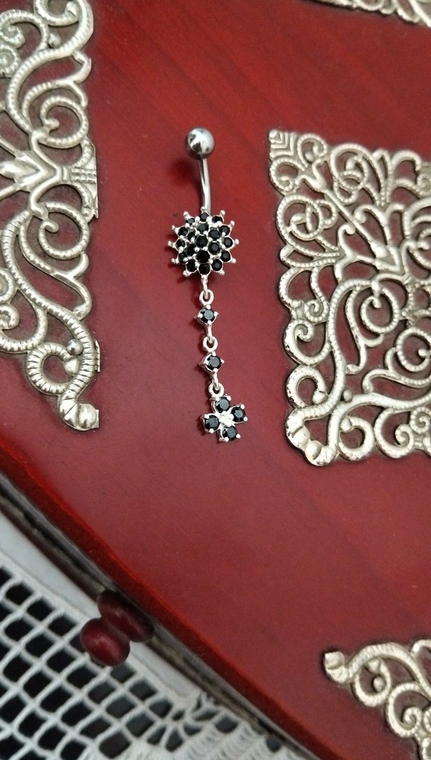 925 Ayar gümüş ithal, uzun, parlak siyah zirkon taşlı kadın göbek piercing.