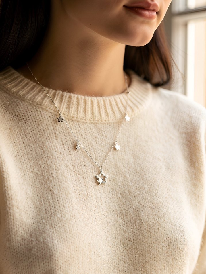 Materyal: Tamamı 925 ayar gerçek gümüştür (Üzerinde damgası mevcuttur). Durum: Ürün sıfırdır, hiç kullanılmamıştır. Etiketi üzerindedir/kutusundadır. Tasarım: Zarif zincir üzerine dizilmiş, orta kısmı taşlı büyük yıldız ve yanlarda minimal küçük yıldız detaylı "Şans Kolyesi" modelidir. Renk: Gümüş rengi