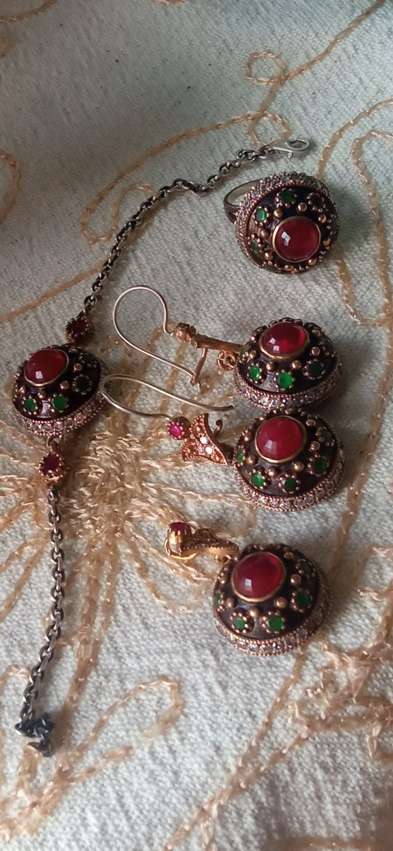 Bohem tarzda, etnik desenli, koyu çok renkli boncuklardan oluşan kadın takı seti. Küpe, yüzük ve kolye içerir, düğün için uygundur.