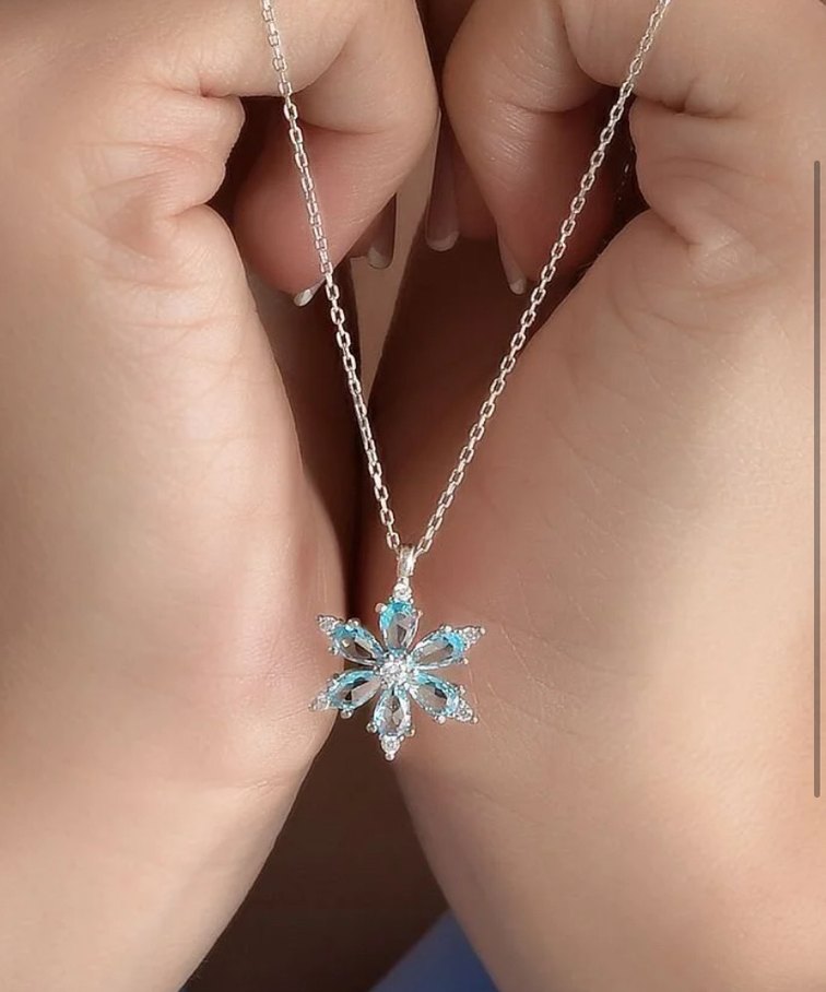 Bohem tarzda, zincir detaylı ve turkuaz çiçek desenli kadın kolye. Normal midi uzunlukta, günlük kullanıma uygun.