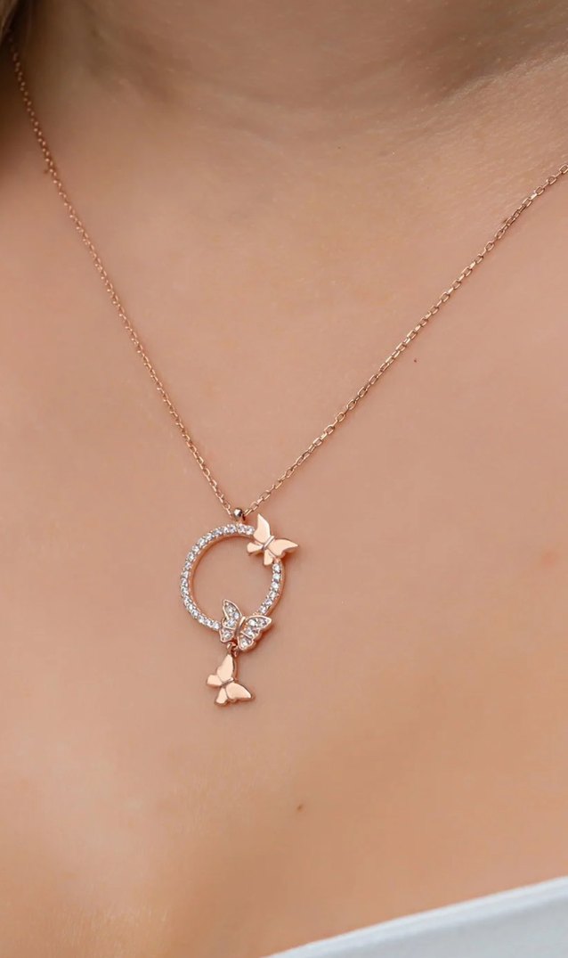 Zincir detaylı, kısa uzunlukta, kelebek figürlü ve taşlı yuvarlak uçlu, altın renkli minimal kadın kolyesi. Günlük kullanıma uygun.