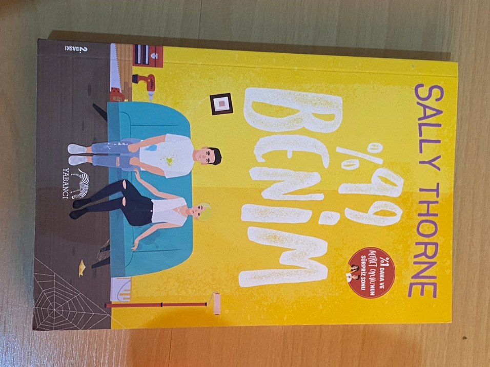 "%99 Benim" adlı roman, iki karakterin kanepede oturduğu renkli kapağıyla dikkat çekiyor. Çağdaş ve ilgi çekici bir hikaye sunuyor.