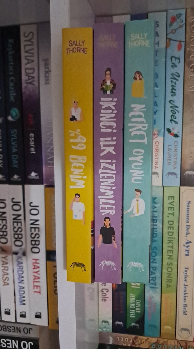 Sally Thorne'un üç romanı: '%99 Benim,' 'İkinci İlk İzlenimler' ve 'Nefret Oyunu' renkli kapakları ve çizimli karakterleriyle bir arada.